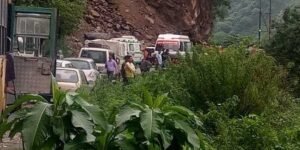 Shimla : Chandigarh-Manali National Highway was disrupted by a landslide at Aaut Shiv mandir in Mandi district this morning a...