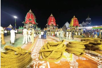 of the grand chariots in the afternoon. Lakhs of devotees from across the country and abroad are expected to participate in the sacred event. As elaborate arrangements have been made for the car festival on Friday, the pilgrim town has been heavily fortified with approximately 10,000 security personnel, including Central Armed Police Forces, deployed for the annual RathYatra of Lord Jagannath, set for June 27. Â Over 275 AI-powered CCTV cameras have been installed across the town for surveillance, monitored 24/7 from a newly established Integrated Command and Control Room. The enhanced security measures also include National Security Guard snipers on rooftops along the BadaDanda, antidrone technology, police drones, anti-sabotage teams, bomb squads, and dog squads with Marine Police, Coast Guard, and Indian Navy securing the seafront. Over 15 lakh devotees are expected to visit the town from across India and abroad to participate in the annual sojourn of Lord Balabhadra, Devi Subhadra, and Lord Jagannath, which transcends caste and religion. A real-time chatbot has been launched to assist visitors with parking availability, route maps, and directions to vacant parking spaces. The traffic regulations will come into effect from Thursday
